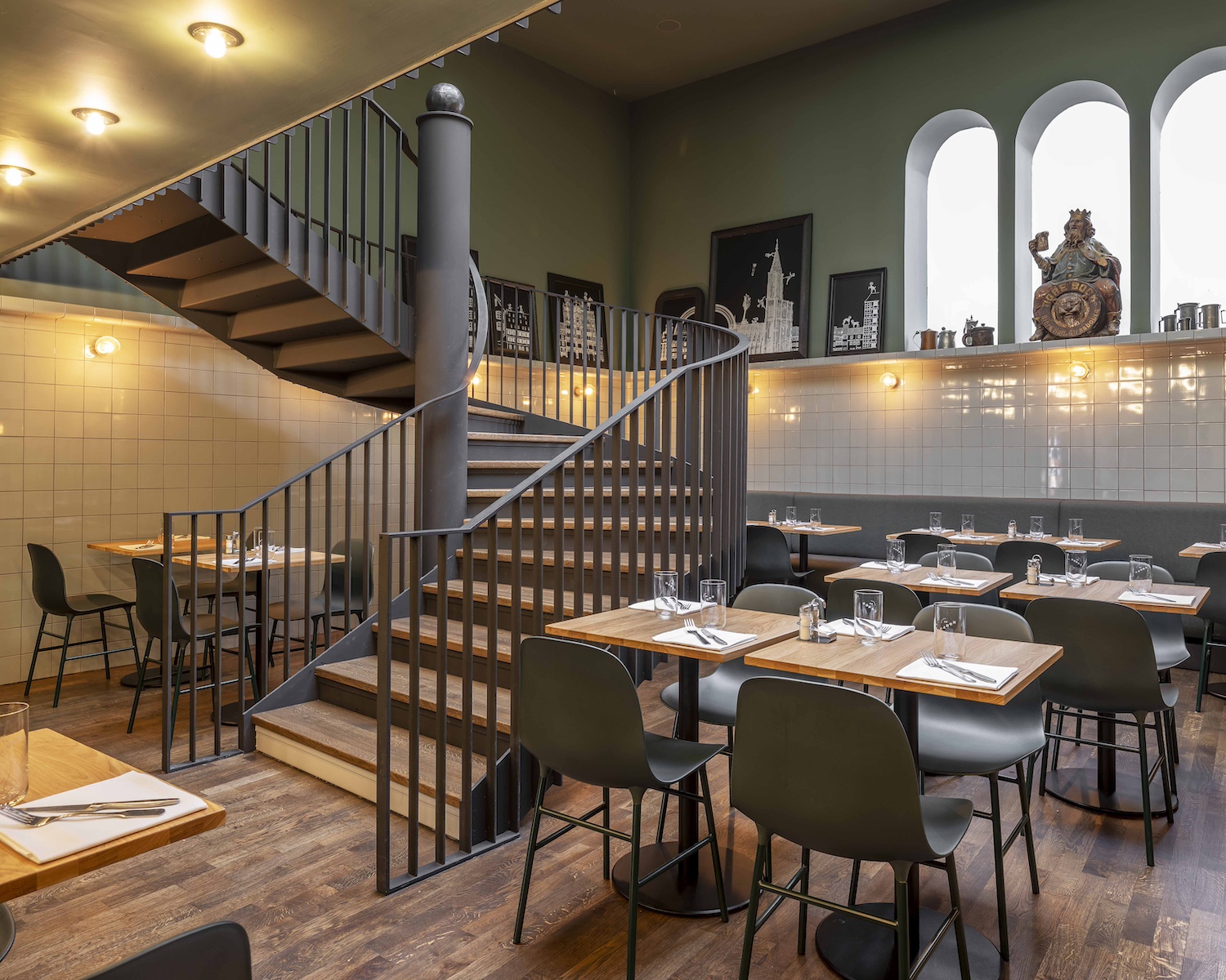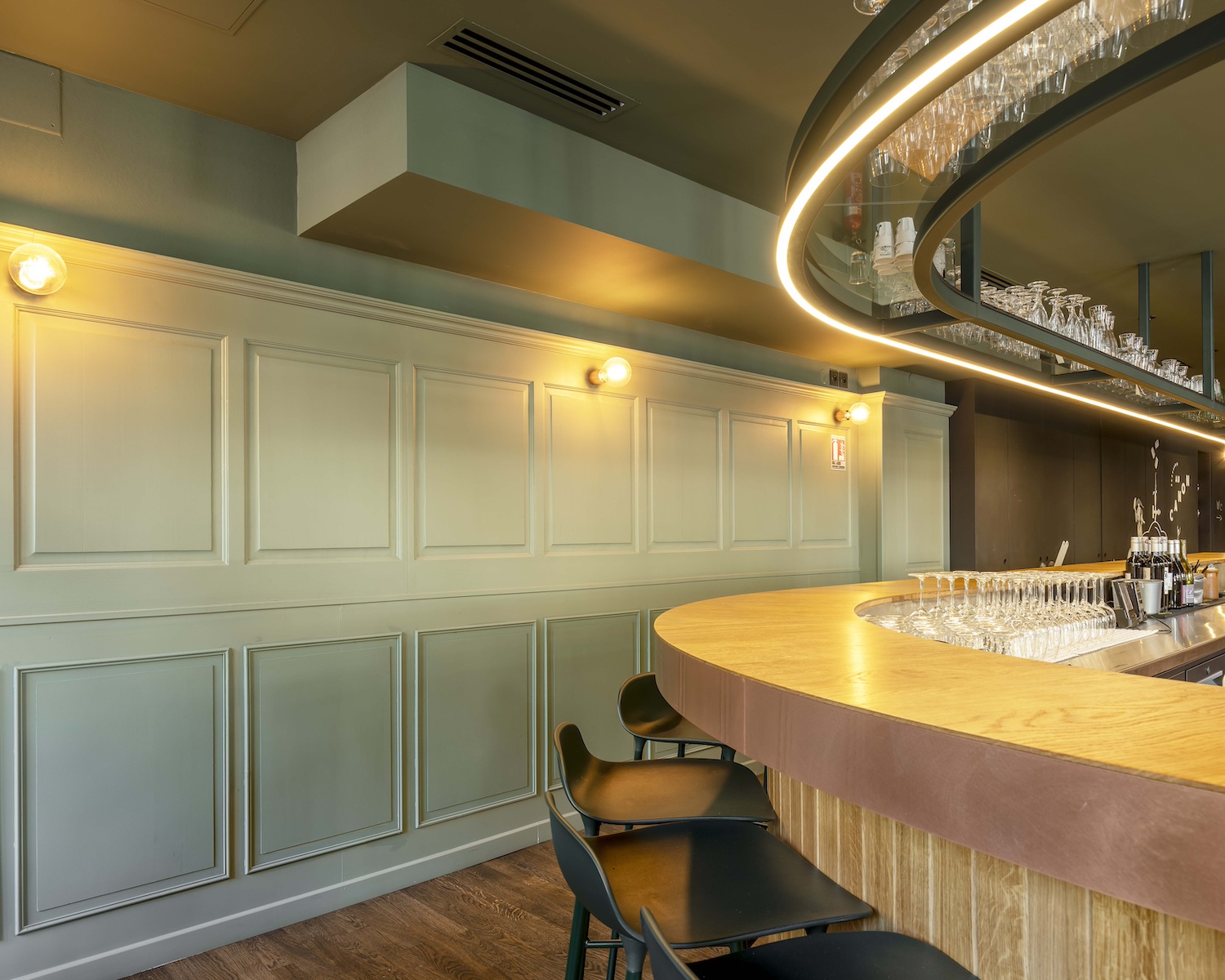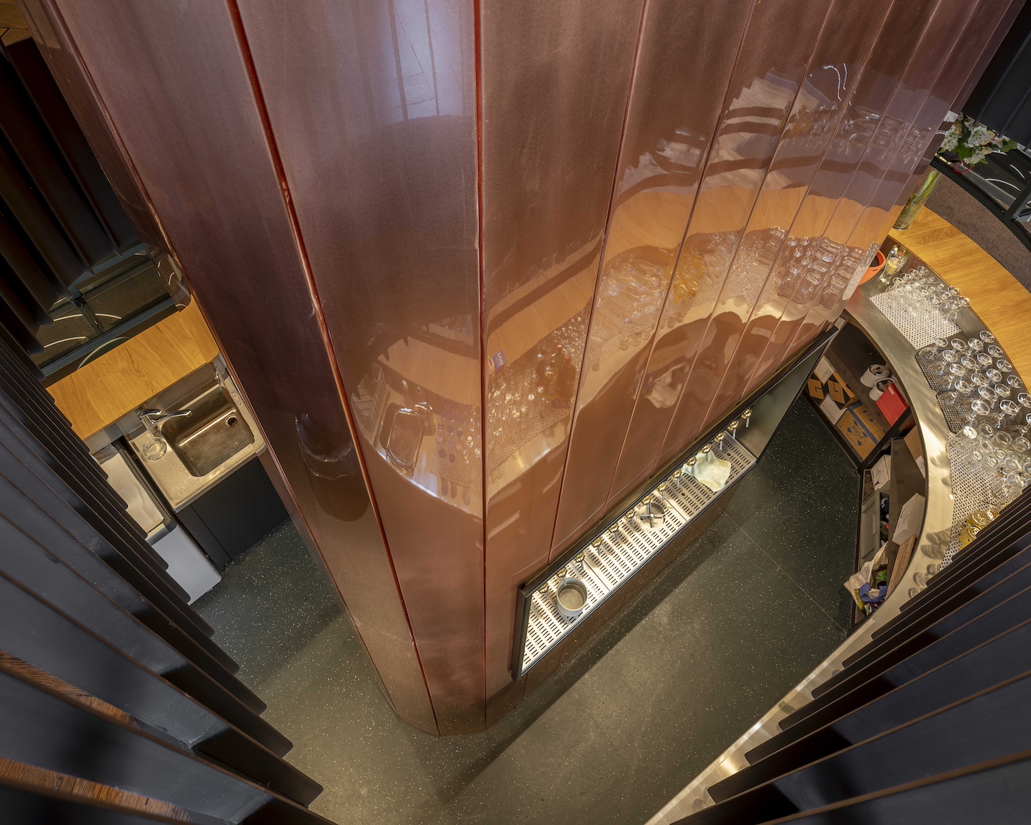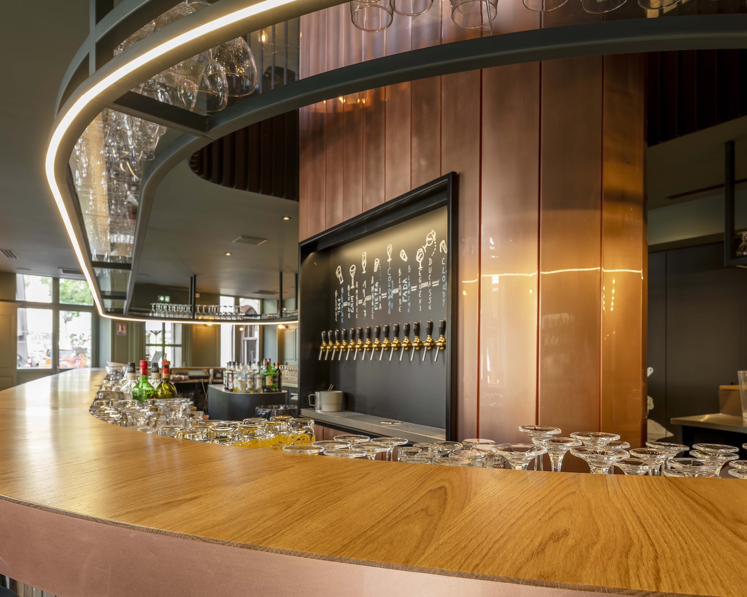 Bar monumental de 22 mètres, colonne en cuivre sur deux niveaux, verrière culminant à plus de 8 mètres, luminaire prestigieux en hommage à la grande tradition brassicole alsacienne : chaque choix de matériaux et de finitions a été pensé pour préserver l’âme du lieu tout en lui insufflant une nouvelle élégance.