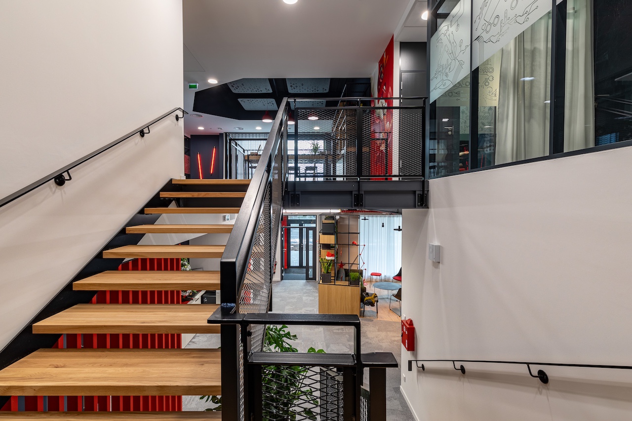 Au sein du Parc d’activité le Bonaparc, ce bâtiment intègre 650 m² de bureaux et 360 m² d’activité. C’est ici que Würth Elektronik France a installé ses bureaux conçus comme une véritable vitrine de l’entreprise, aménagés et décorés selon leurs codes couleurs.