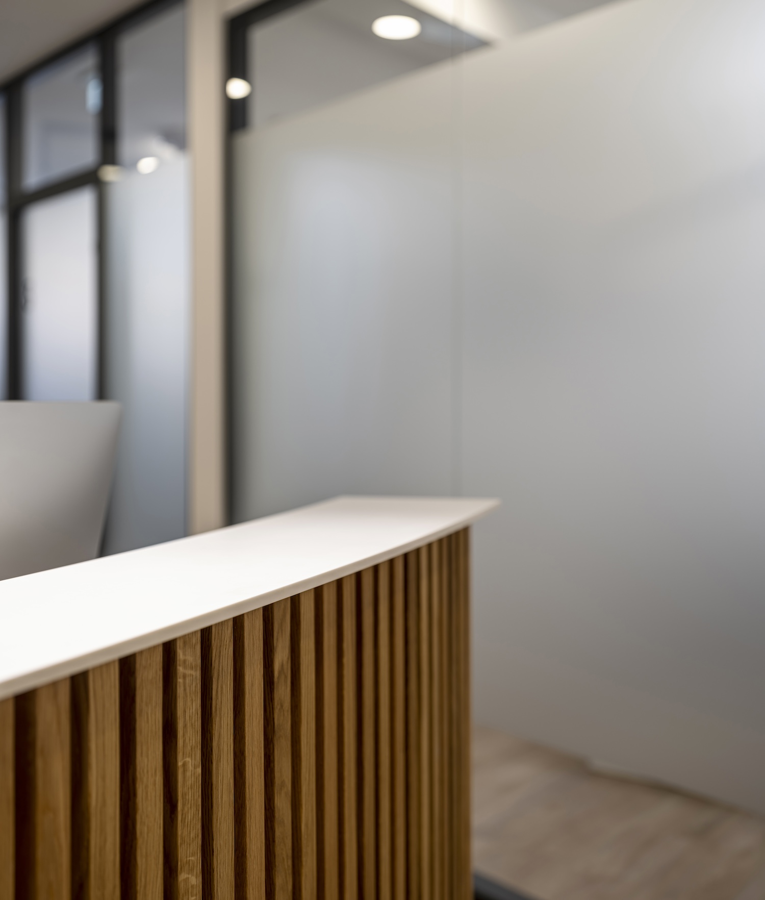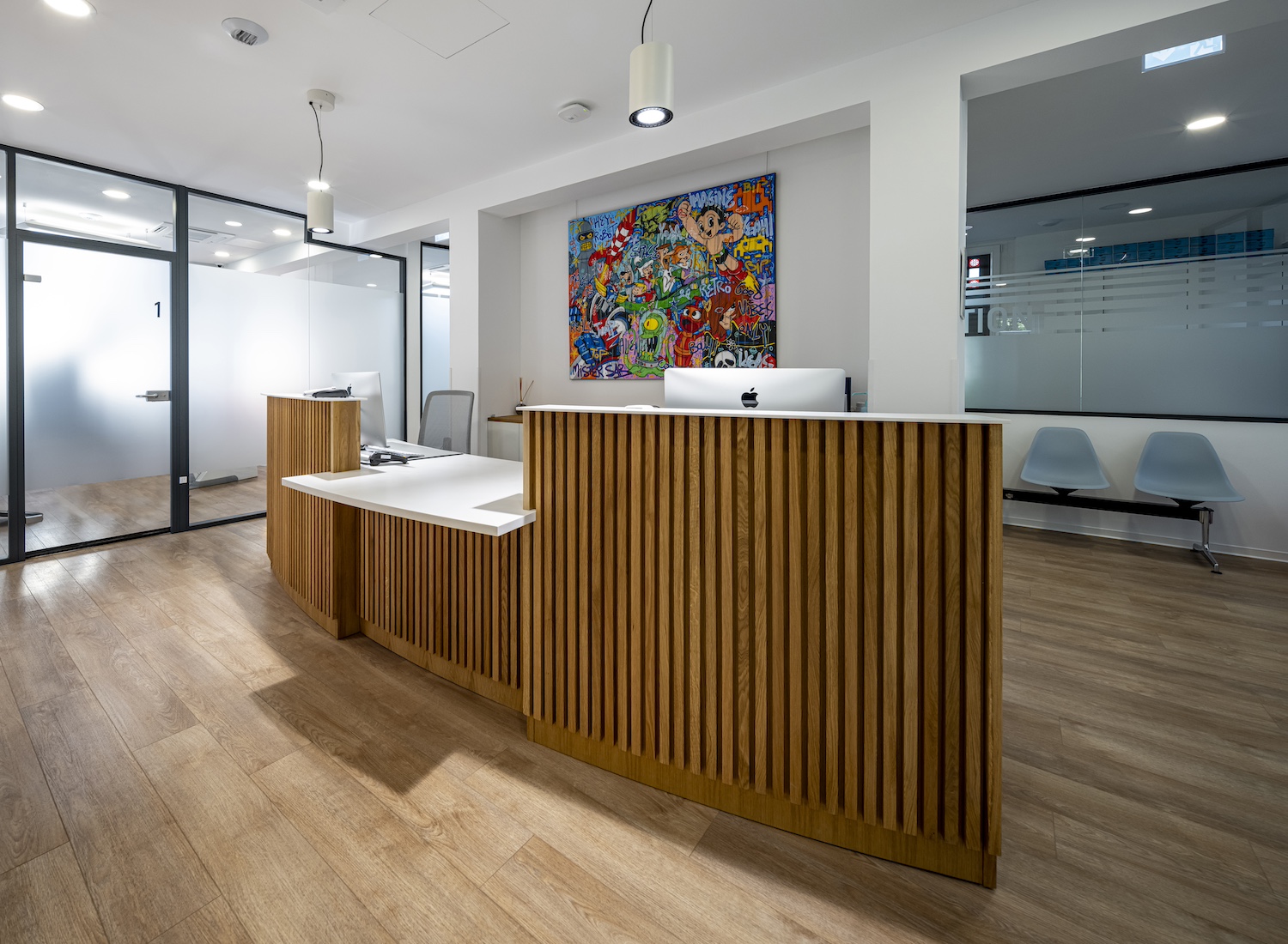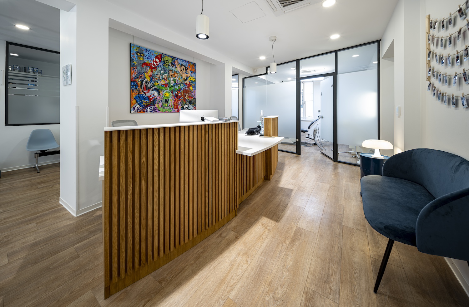 Parce qu’un cabinet médical est aussi un lieu d’accueil, plusieurs éléments ont été conçus et réalisés sur mesure par nos menuisiers, à l’image du desk d’accueil, pensé comme un repère à la fois fonctionnel et élégant.
