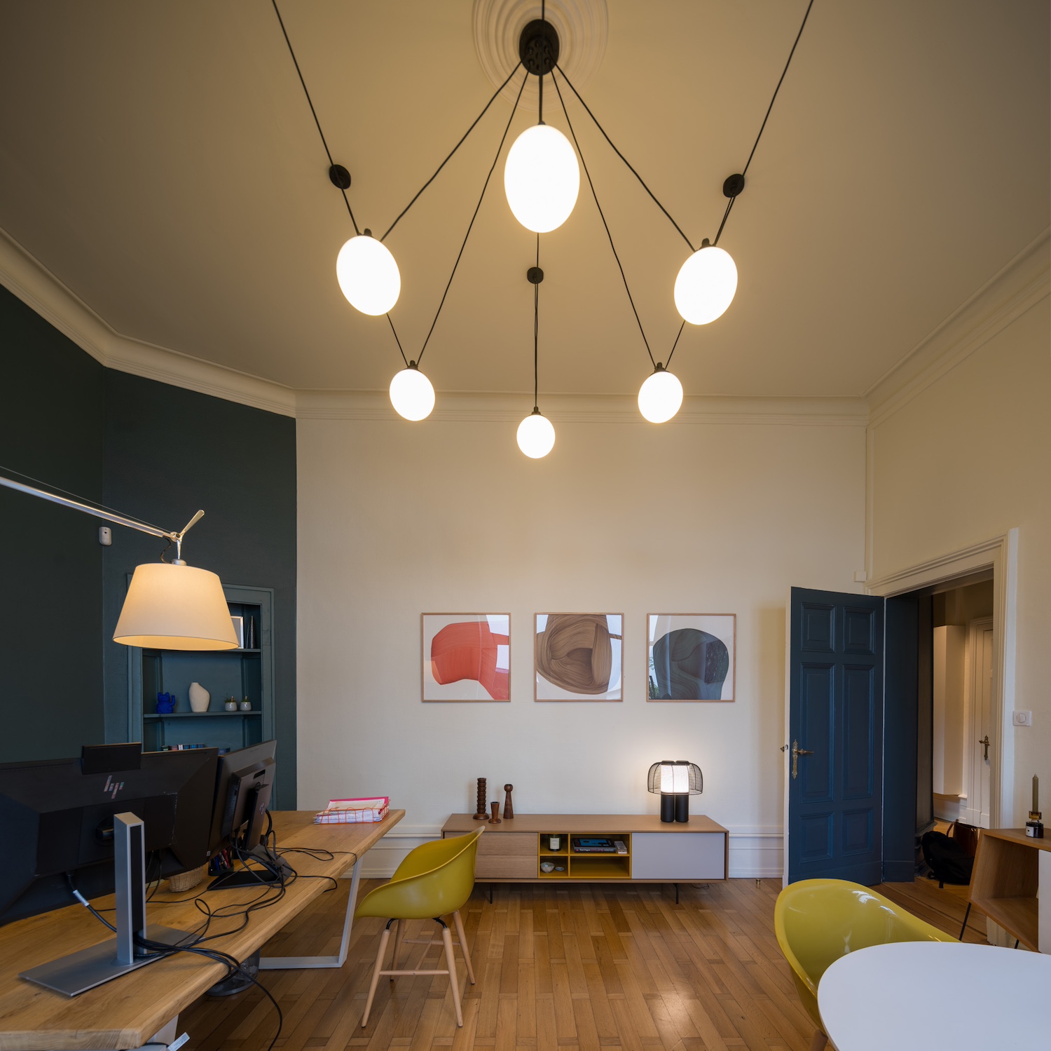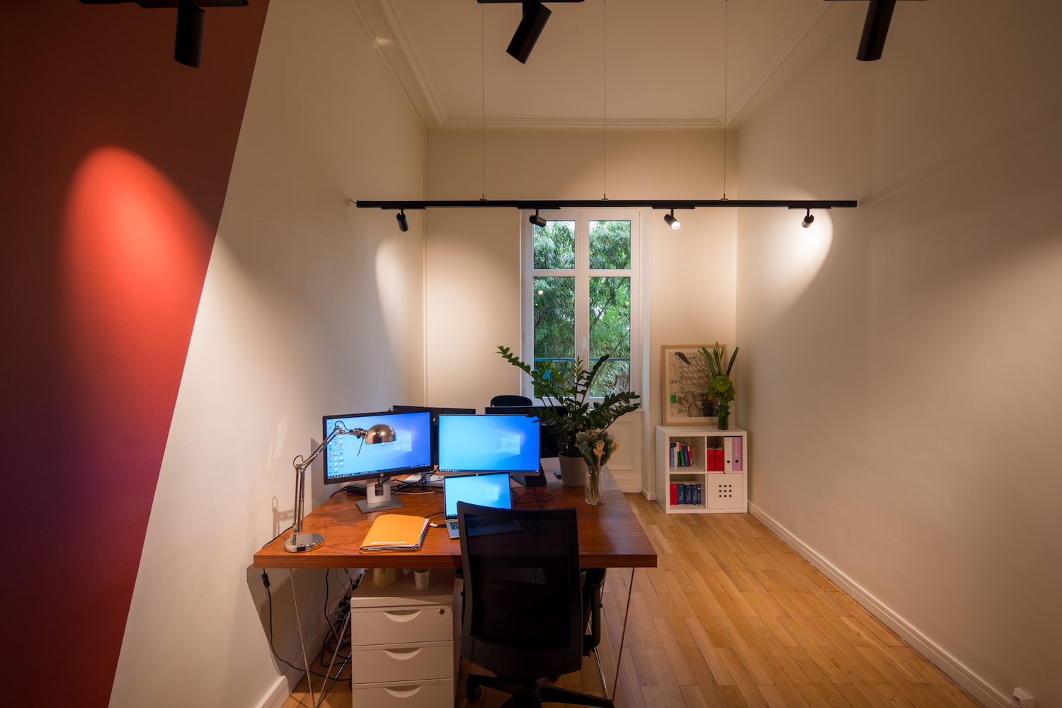 • Éclairage étudié, révélant chaque volume et dessinant des atmosphères propices à la concentration comme à la réception des clients.