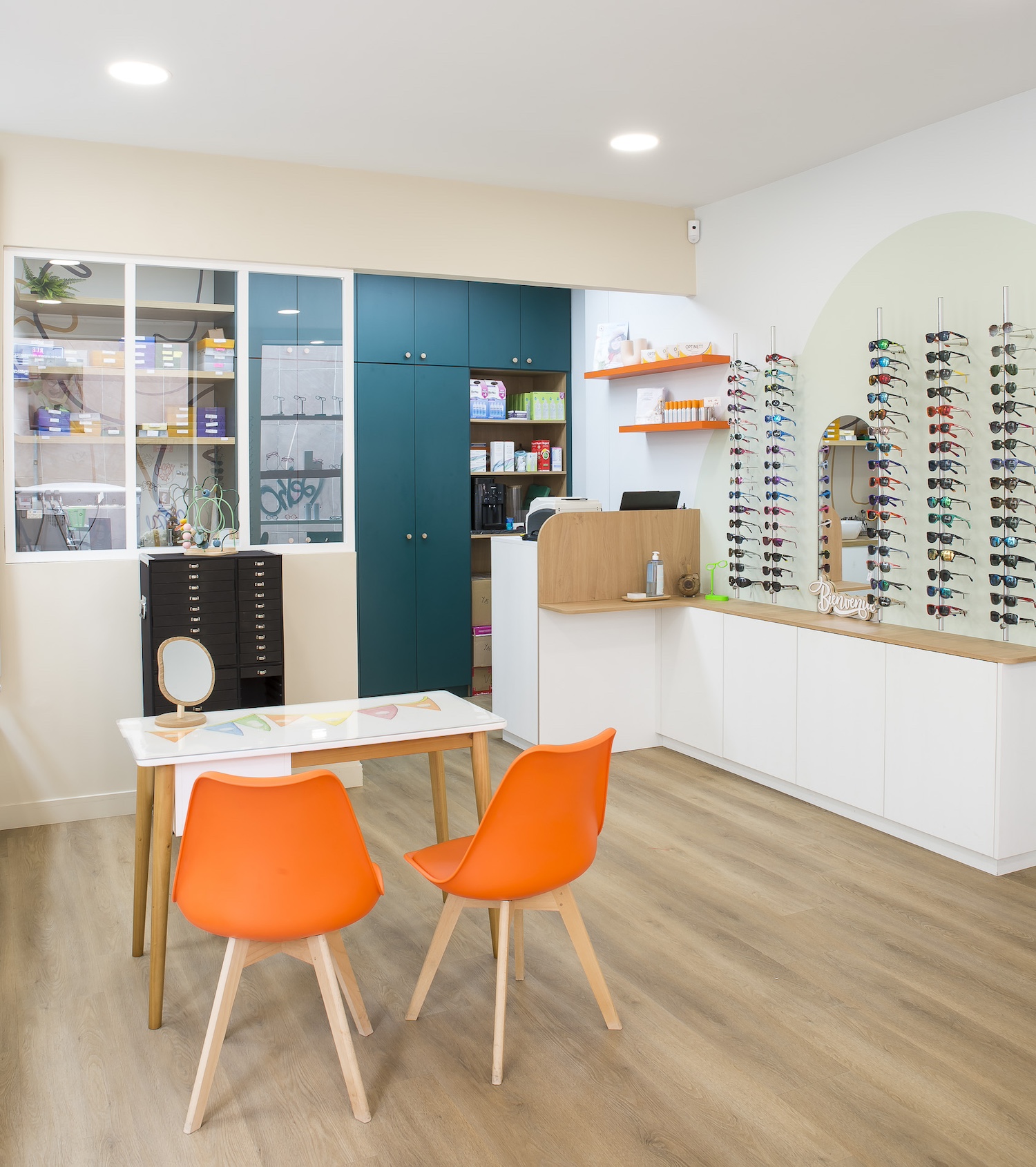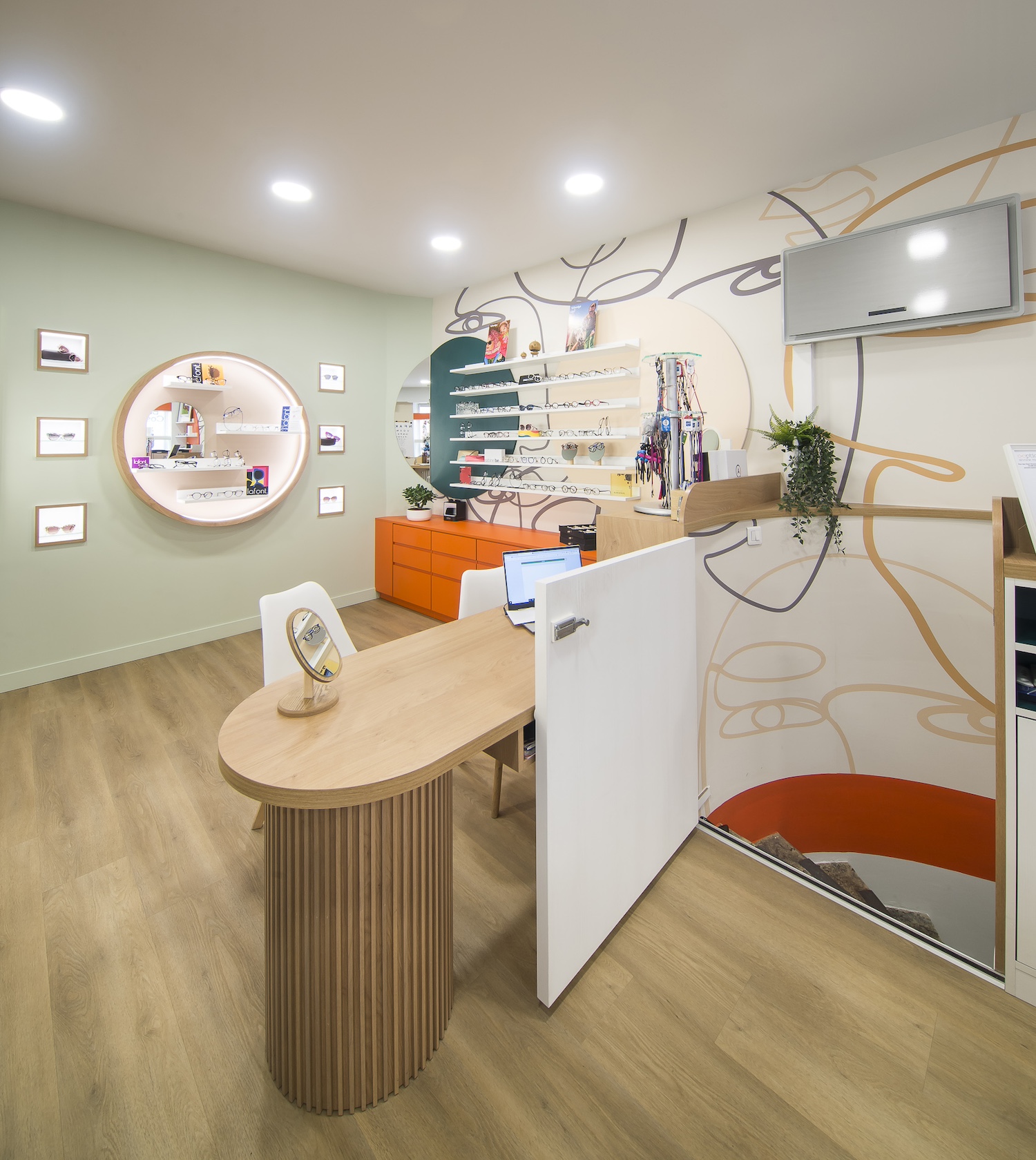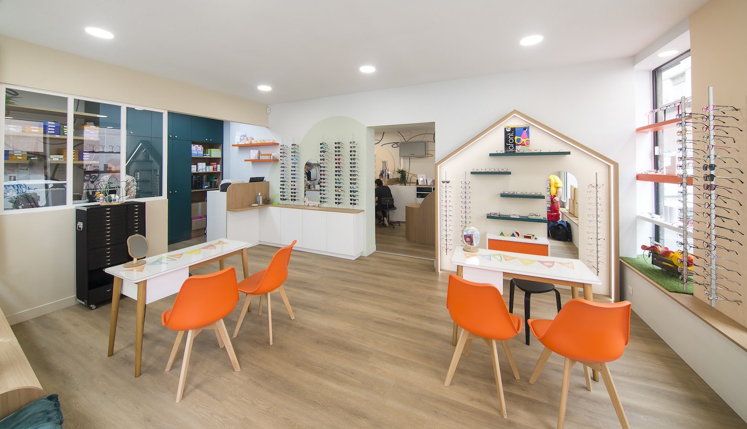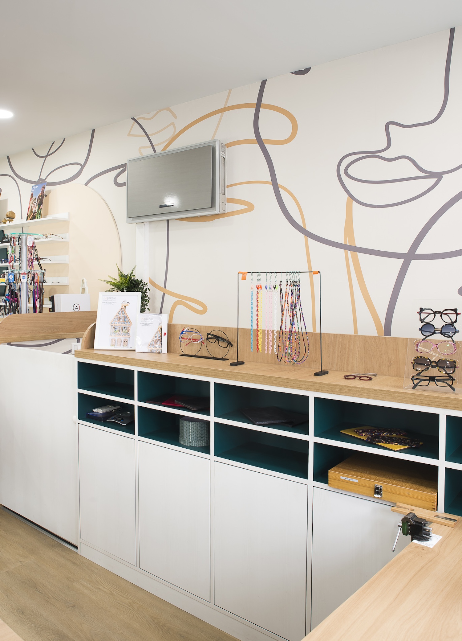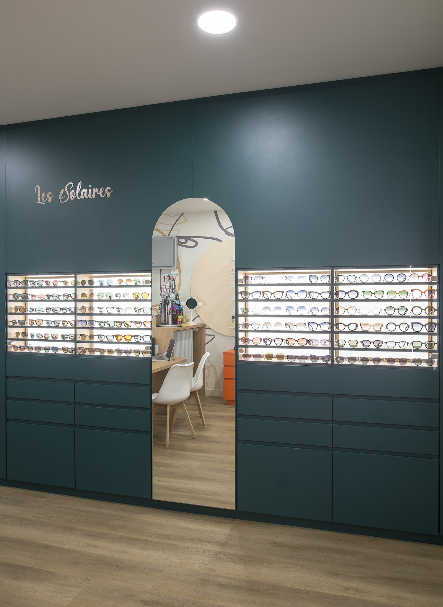 Créatio a accordé une importance particulière à la cohérence entre conception et réalisation. Ici, les ateliers dédiés aux montures et aux verres sur mesure, véritables cœurs battants de la boutique, étaient jusqu’alors peu visibles. Notre mission a été de les révéler. Aux côtés du STUDIO CAMARASA, nous avons travaillé main dans la main avec la cliente pour imaginer un lieu qui lui ressemble, un espace où l’ambiance, les matériaux et la mise en scène expriment naturellement son univers professionnel. L’architecture intérieure a été pensée pour rendre lisible l’expertise artisanale, tout en offrant une expérience chaleureuse et haut de gamme aux visiteurs.
