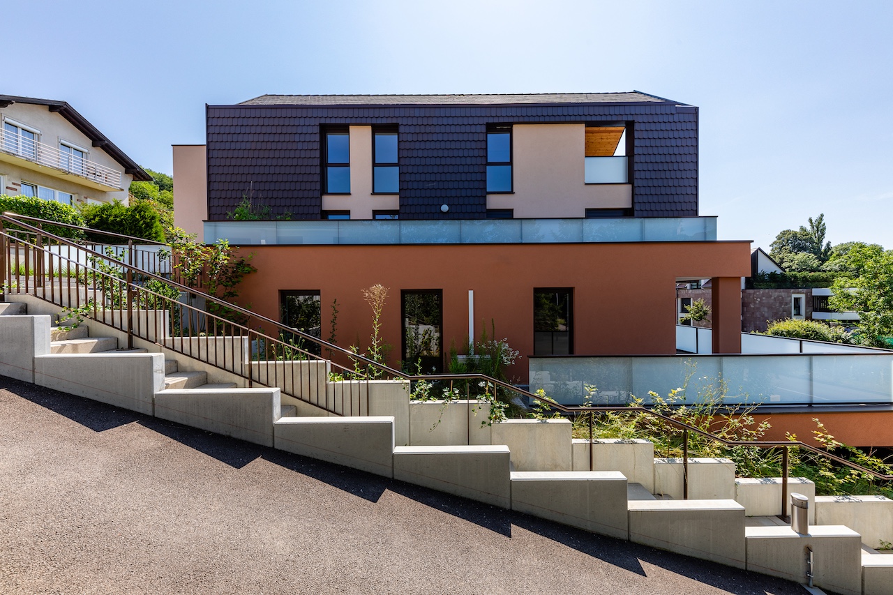 Implantée dans un environnement calme et verdoyant, ce programme immobilier neuf propose 5 appartements de standing, du T4 au T5, avec une approche qui conjugue modernité tout en respectant l’identité du secteur : grès, tuile et larges pans de toitures. La conception architecturale privilégie une intégration élégante notamment grâce à une façade en zinc qui apporte une signature contemporaine, tout en restant sobre et parfaitement cohérente avec le cadre d’Obernai.