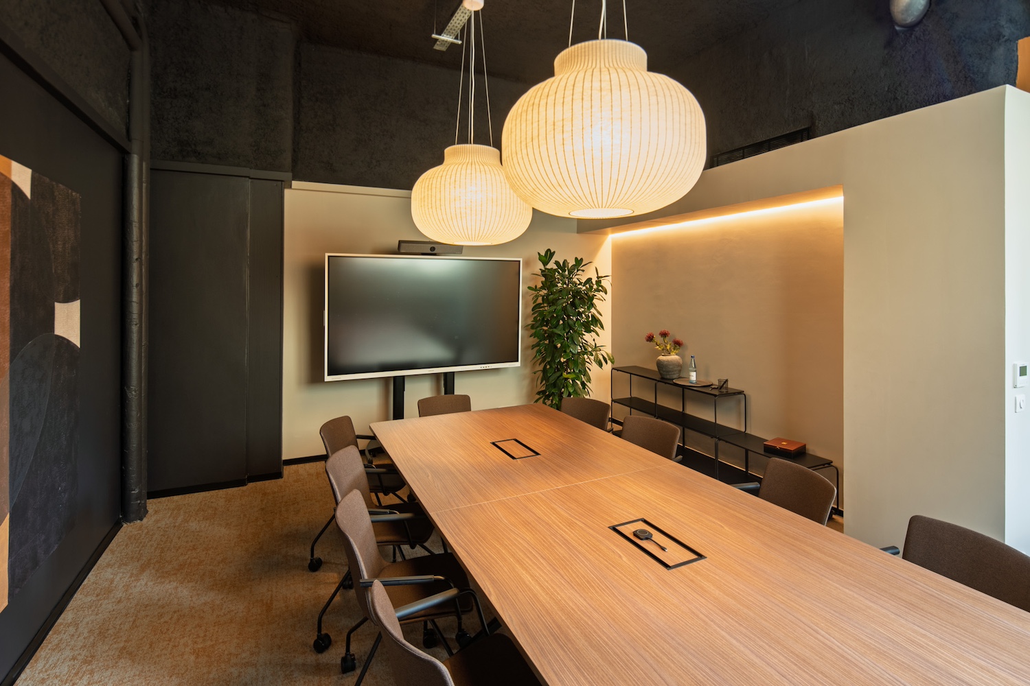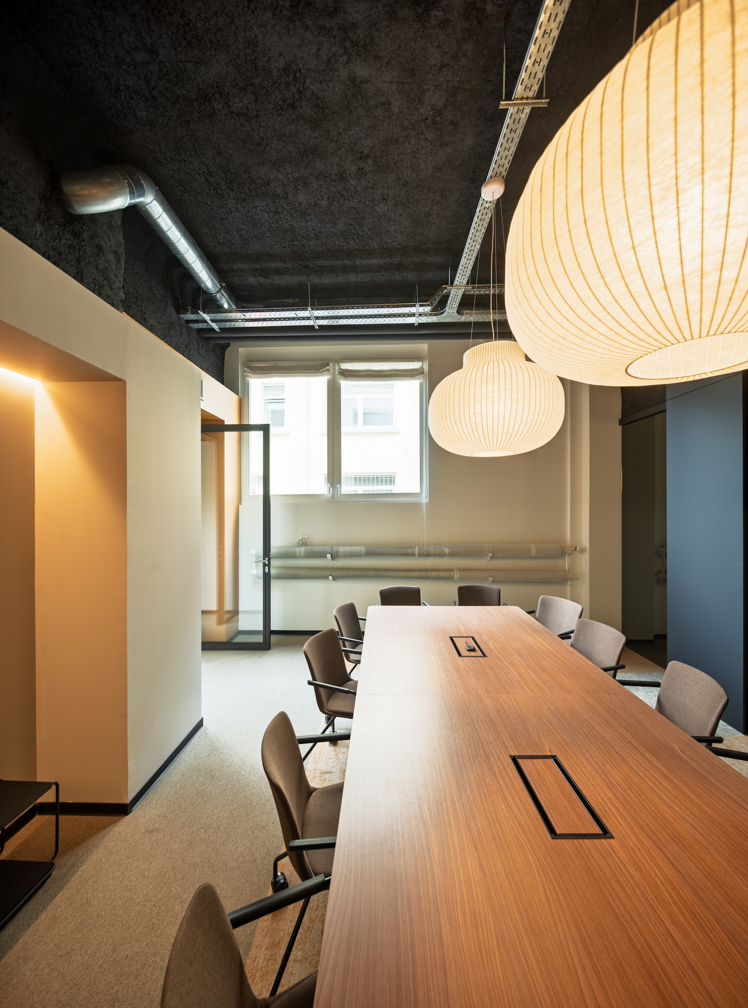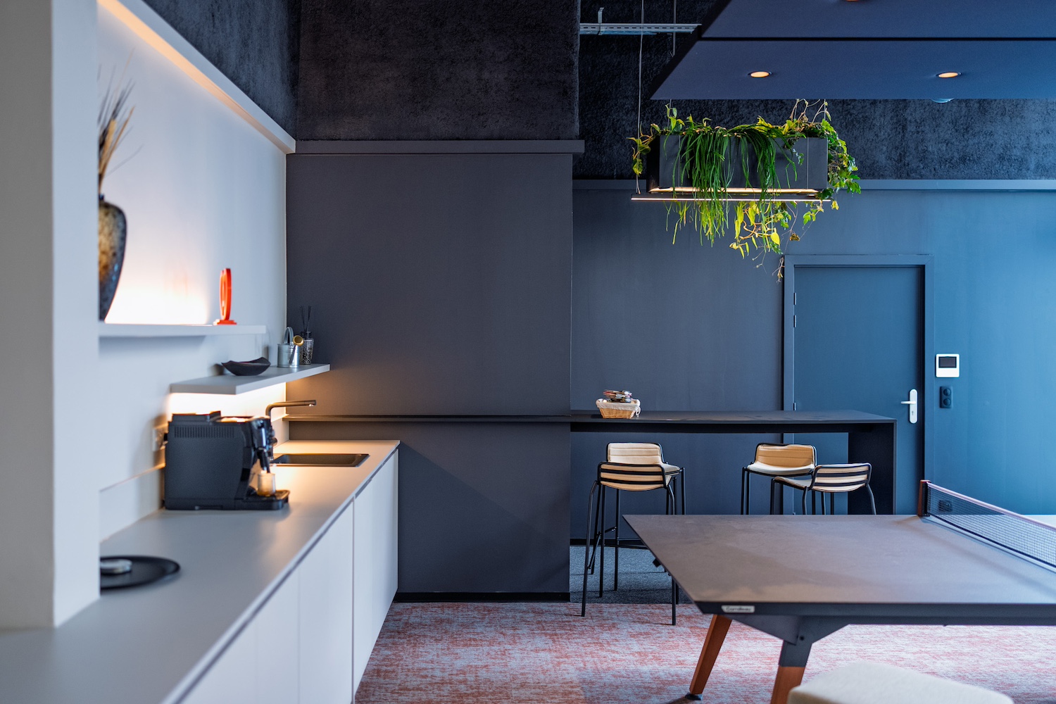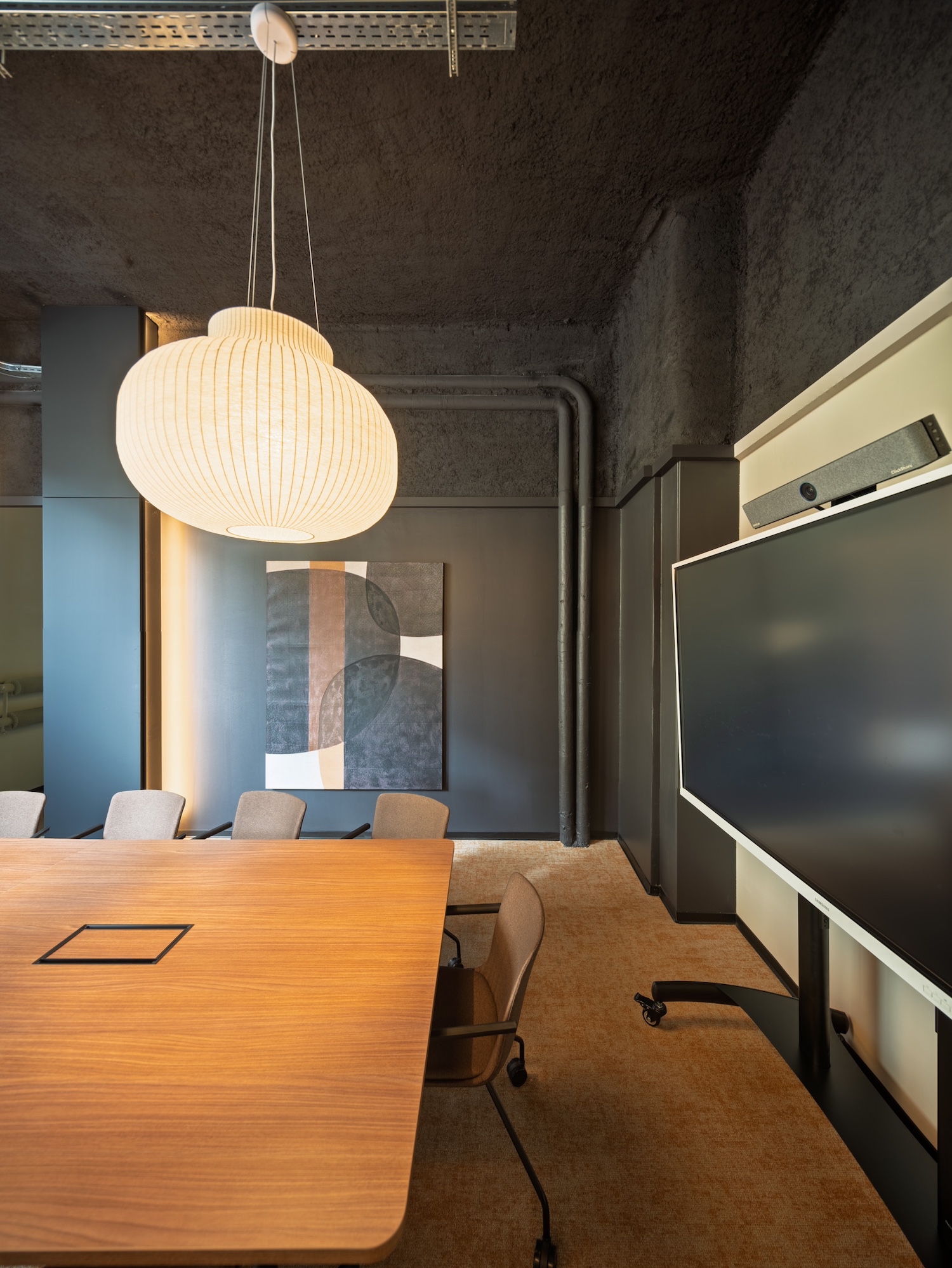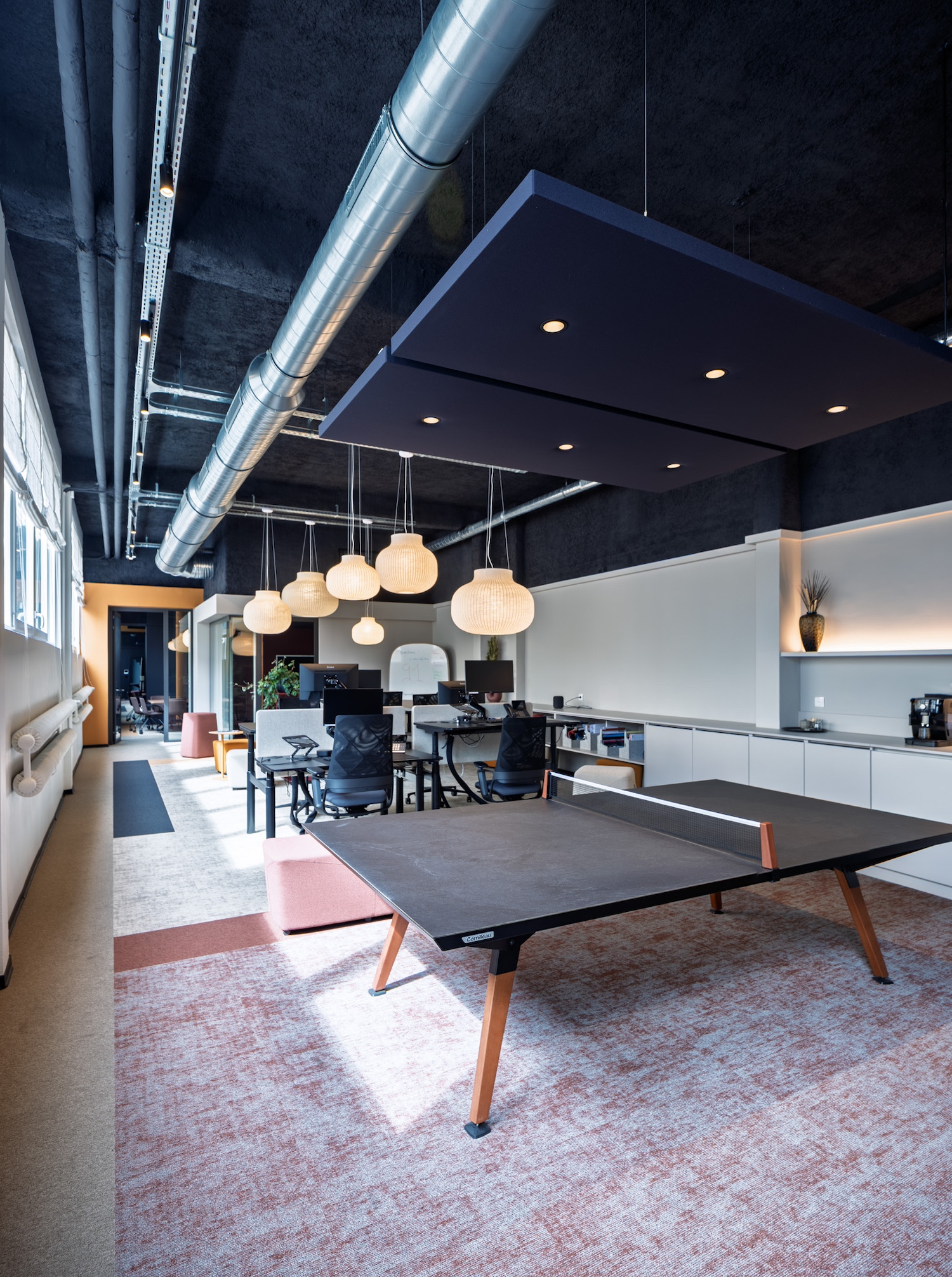 • et une mezzanine coupant la lumière naturelle. Autant de contraintes qui ont été repensées comme des opportunités de créer un lieu singulier, fonctionnel et affirmé.