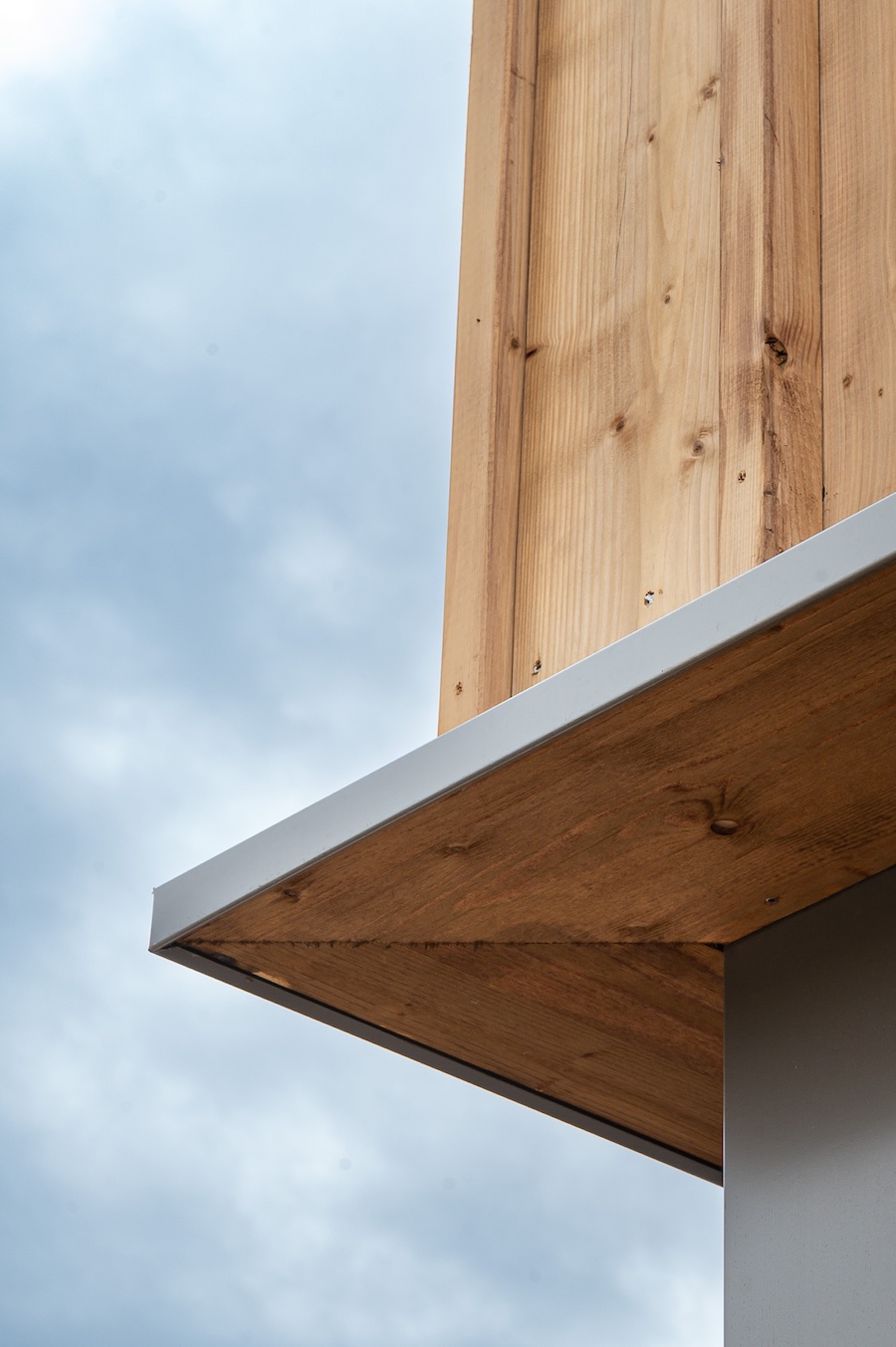 Le projet comprend environ 500 m² de bardage bois en pin autoclave marron, un matériau biosourcé reconnu pour sa résistance et sa tenue dans le temps. Les ouvertures sont soulignées par des ébrasements en tôle aluminium laquée, apportant une finition nette et contemporaine, tout en renforçant la protection des points singuliers.